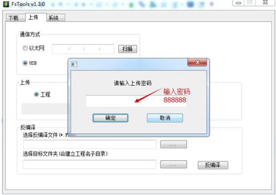2、輸入正確的上傳密碼,默認(rèn)為”888888“,如果默認(rèn)上傳密碼被修改會(huì)提示密碼錯(cuò)誤,或者提示禁止上傳就需要專業(yè)人員進(jìn)行解密了,有需要可以聯(lián)系我們(百度一下速捷工控)